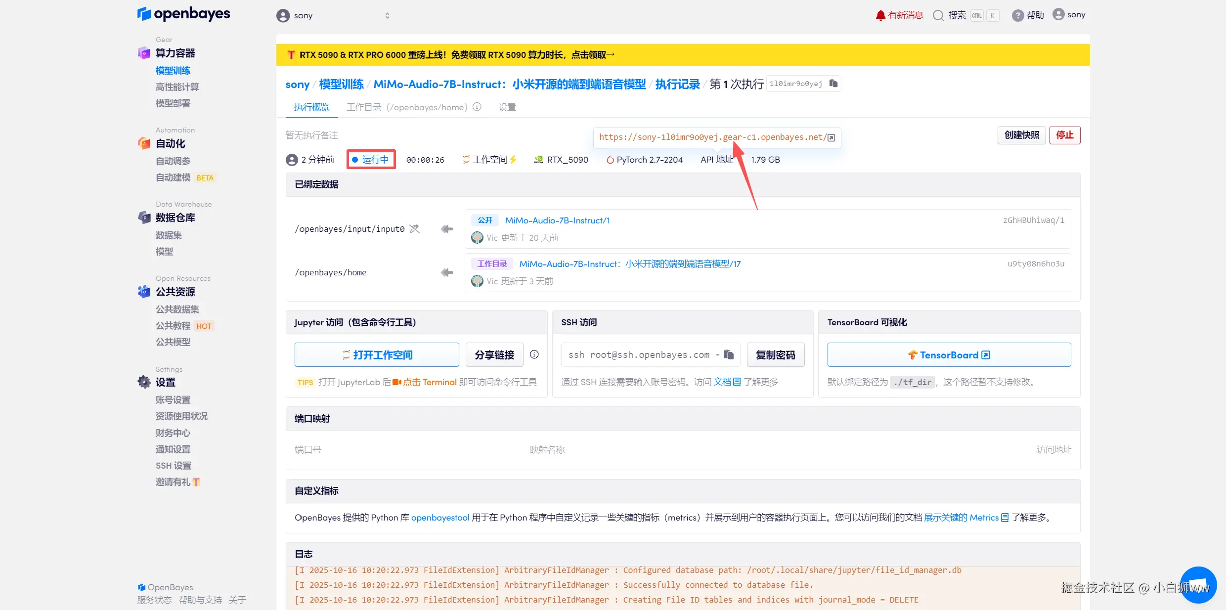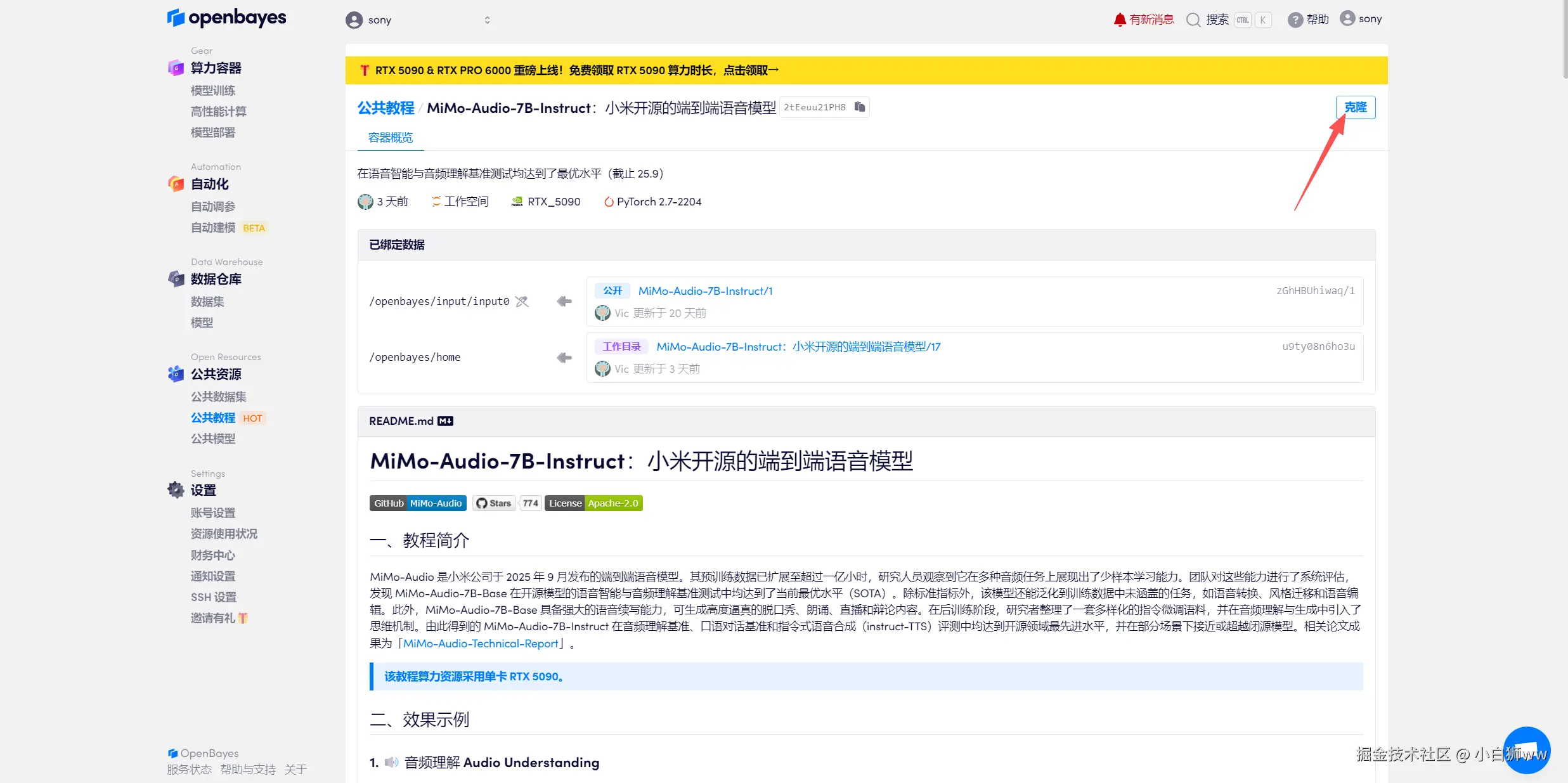 登录 OpenBayes.com,在「公共教程」页面,选择一键部署 「MiMo-Audio-7B-Instruct:小米开源的端到端语音模型」教程。