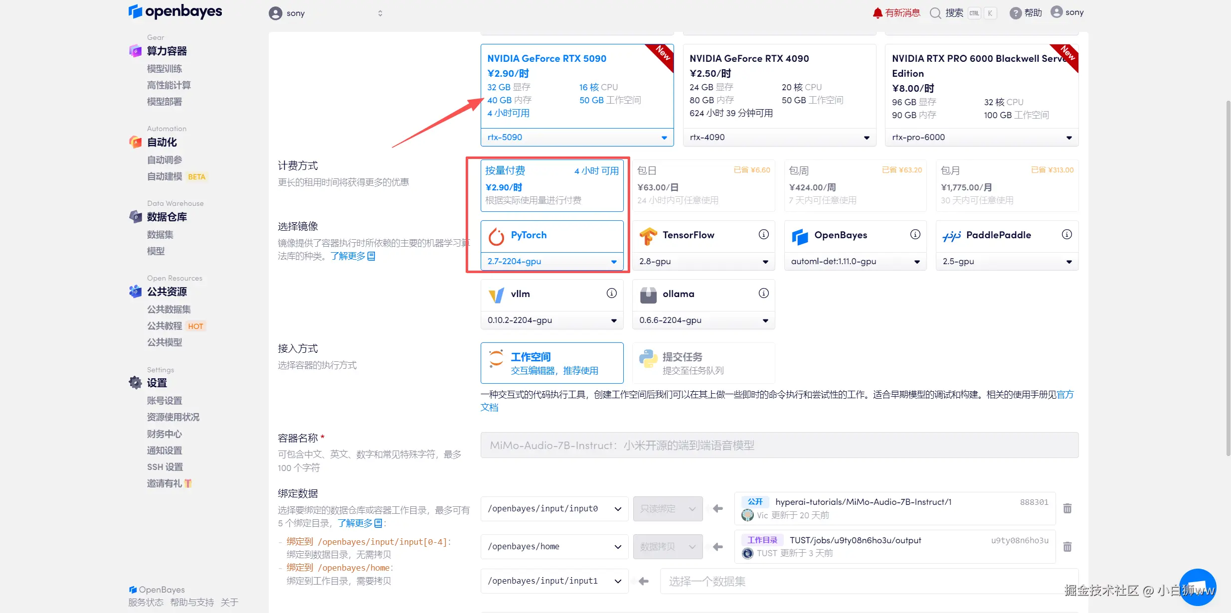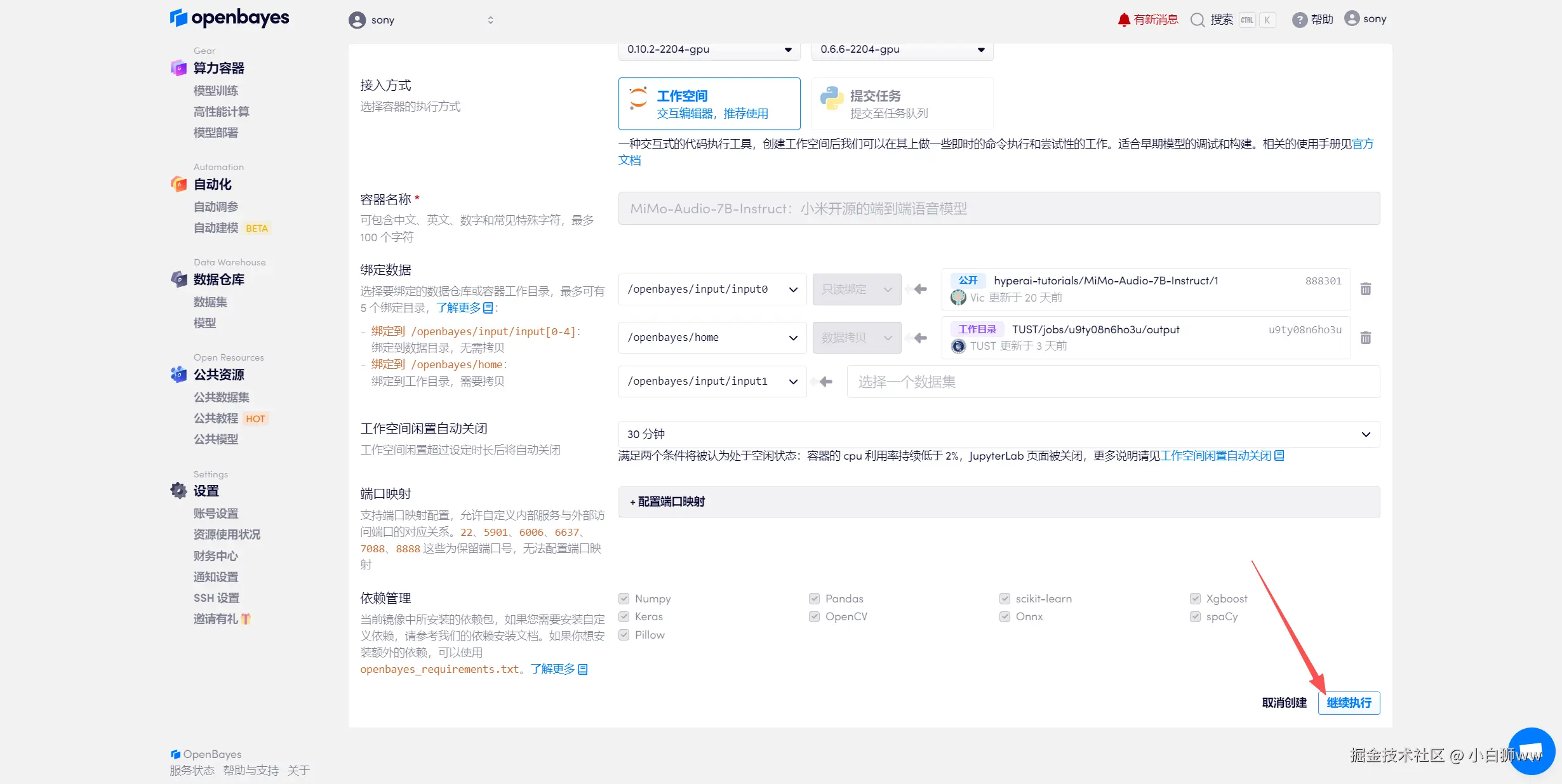 在当前页面中看到的算力资源均可以在平台一键选择使用。平台会默认选配好原教程所使用的算力资源、镜像版本,不需要再进行手动选择。点击「继续执行」,等待分配资源。