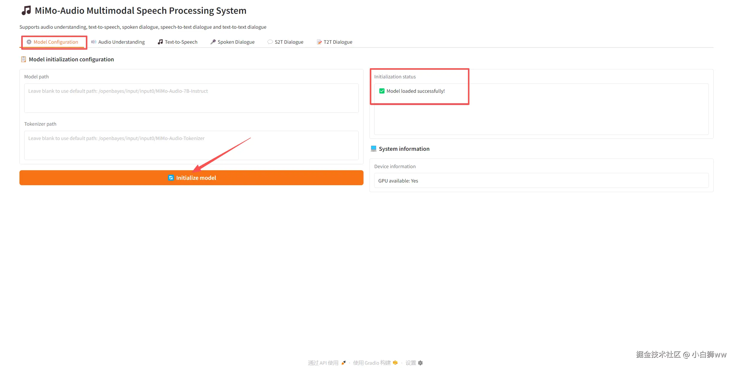 进入 Demo 界面后,首先要初始化权重参数。在「Model Configuration」中使用默认路径,点击「Initialize model」对模型进行初始化。