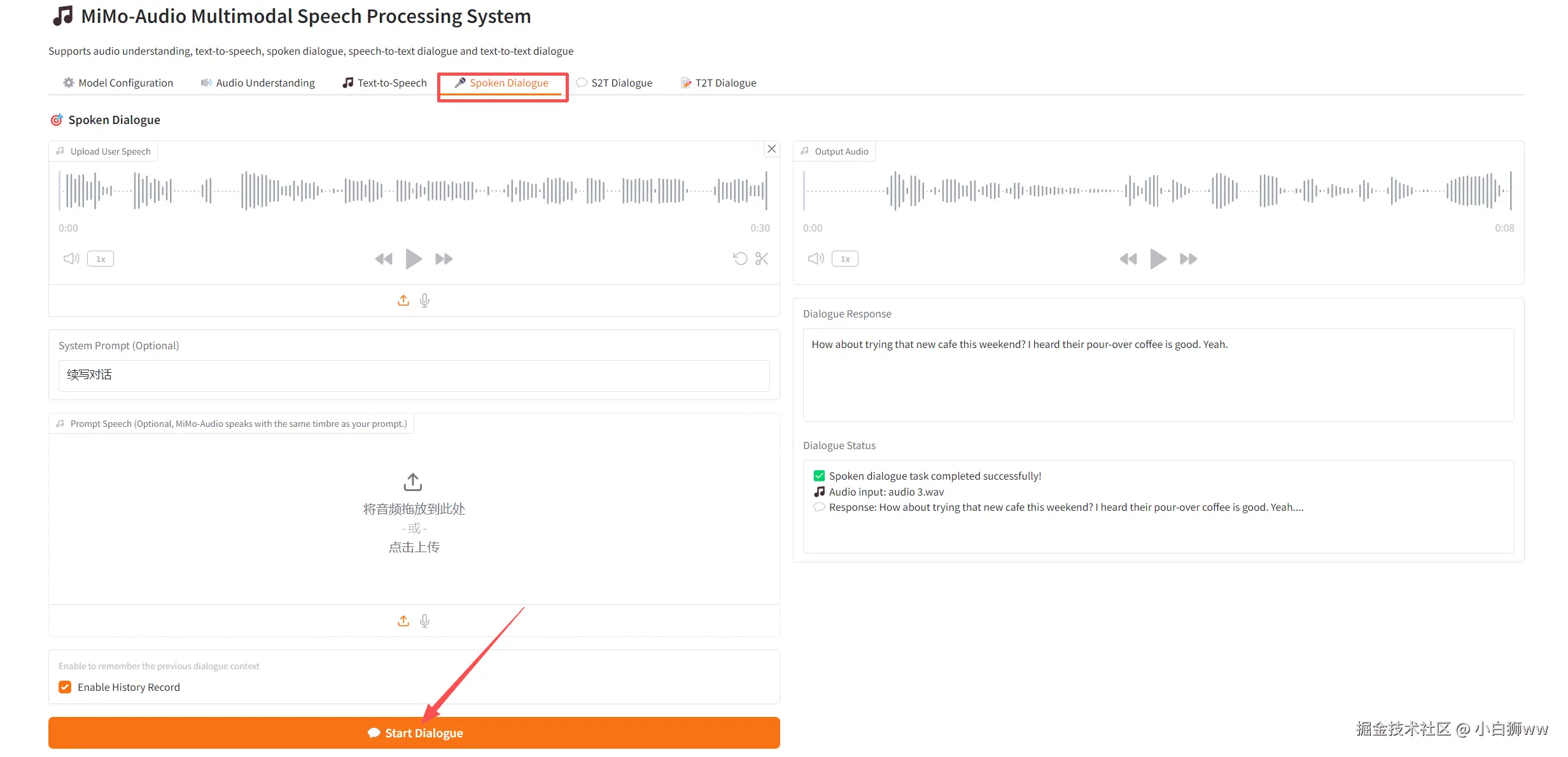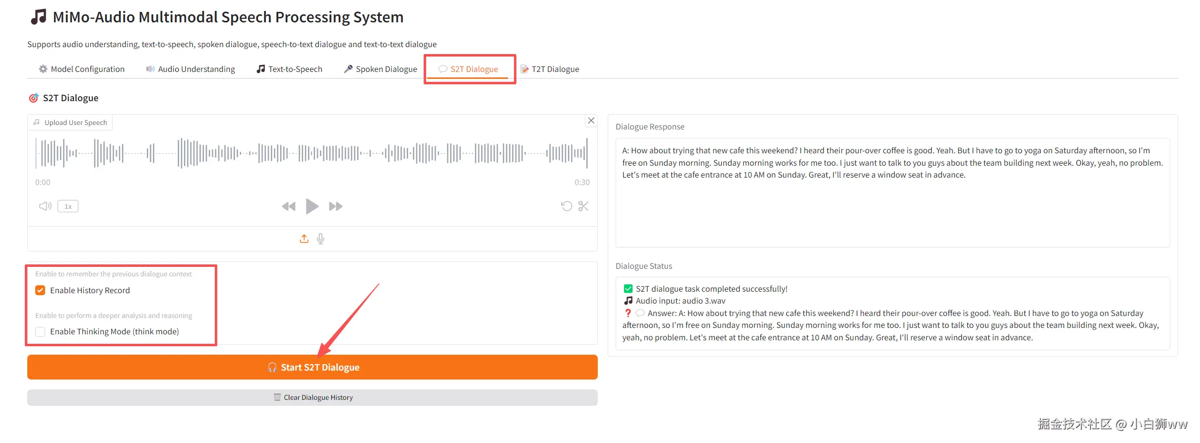 首先上传一段语音,可选择开关历史记录和思考模式,点击「Start S2T Dialogue」开始生成。