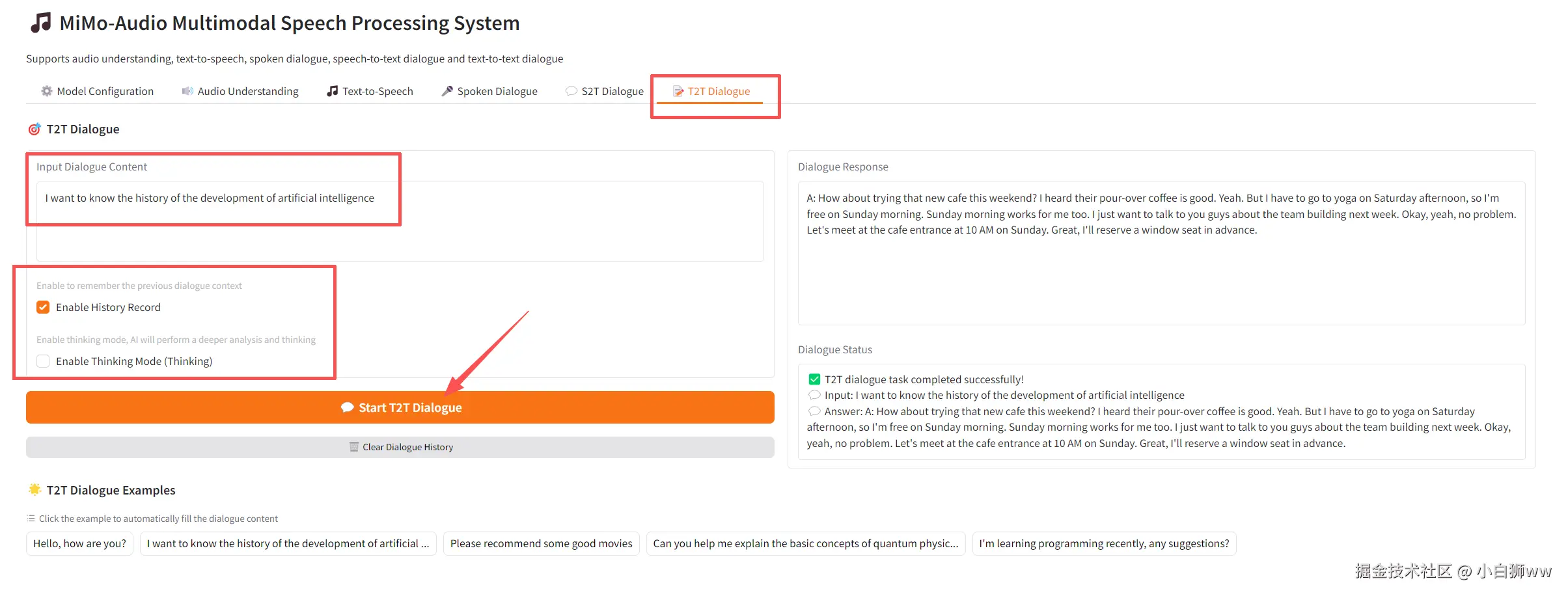在「Input Dialogue Content」中输入问题,选择开关历史记录和思考模式,点击「Start T2T Dialogue」开始文本对话。