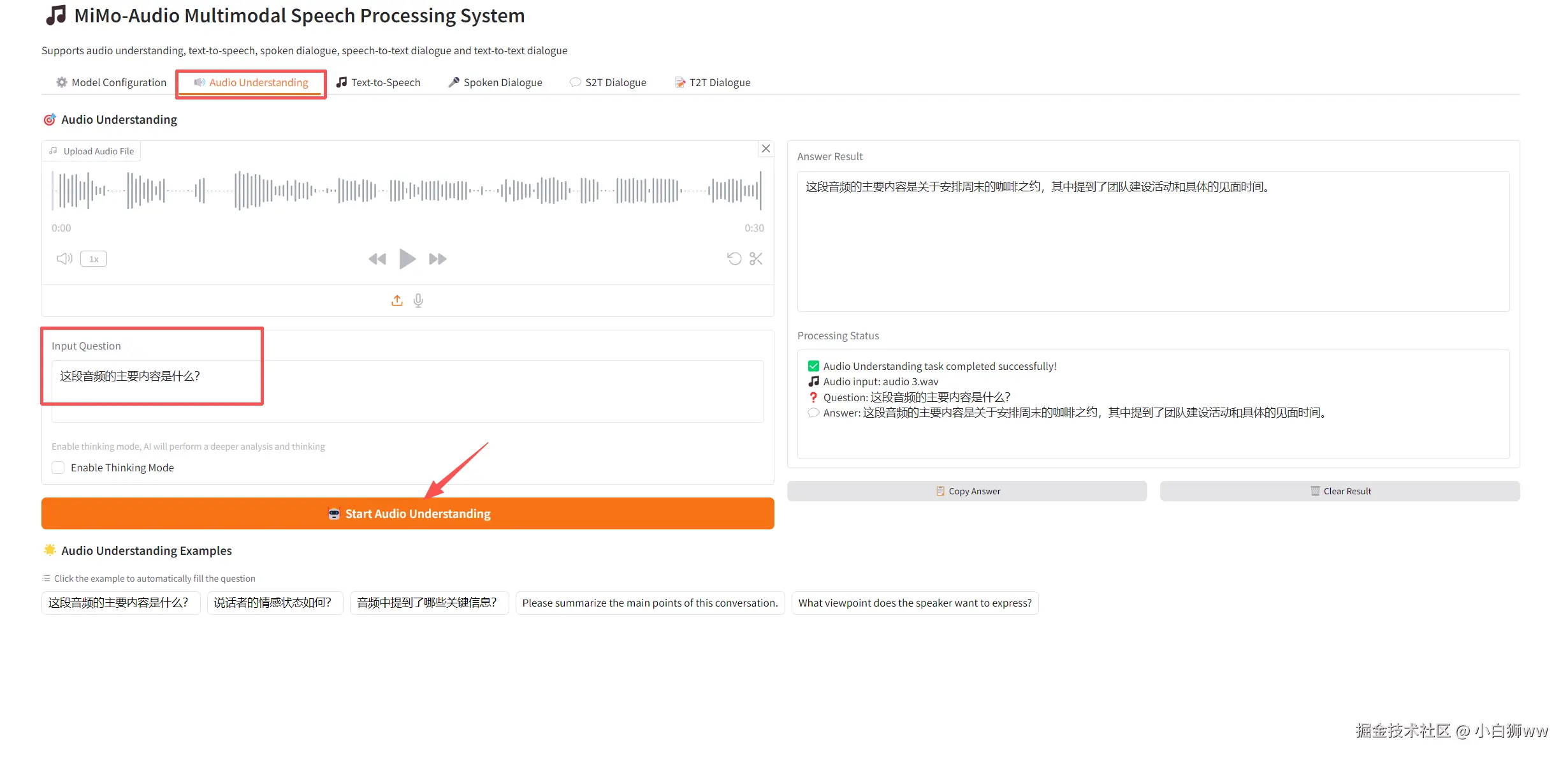 上传一段音频,在「input Question」中输入问题,然后点击「Start Audio Understanding」开始识别。