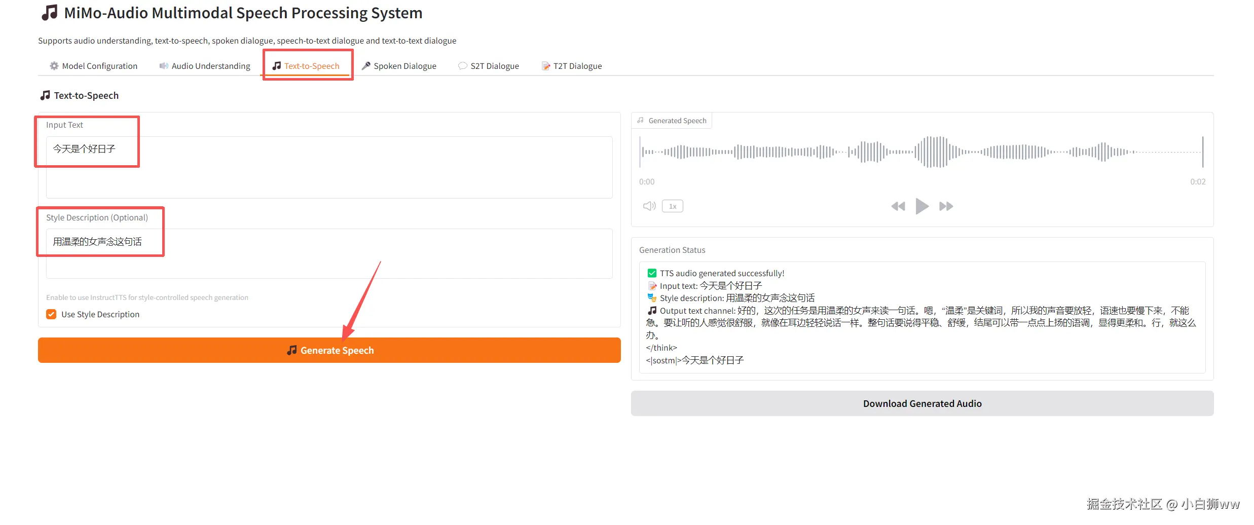 在「Input Text」和「Style Description (Optional)」中分别输入需要转换的内容和音频指令,点击「Generate Speech」开始生成。