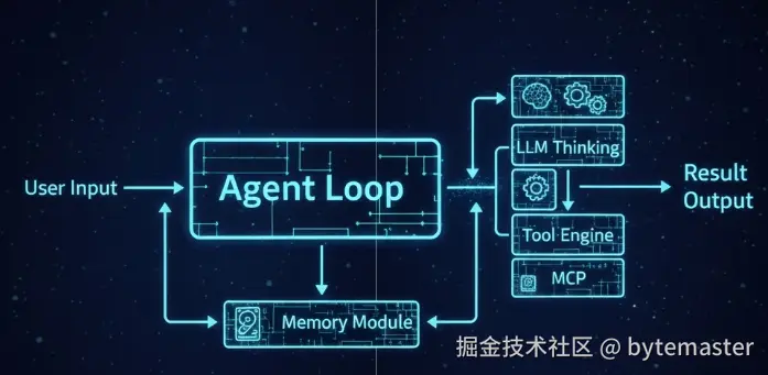 - Agent Loop 核心循环:整个系统围绕一个核心的异步函数运转,协调用户输入、LLM 通信和工具执行。