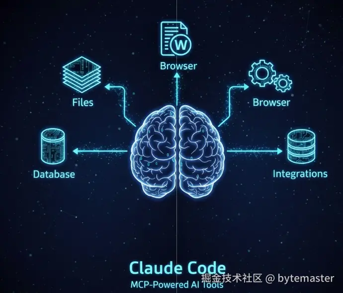 如果说内存是大脑,那 MCP (Model Context Protocol) 就是 AI 的"手和脚"。它是一套开放协议,允许 Claude Code 调用外部工具,从而与真实世界互动。这是它能够执行复杂任务的"王炸"功能。