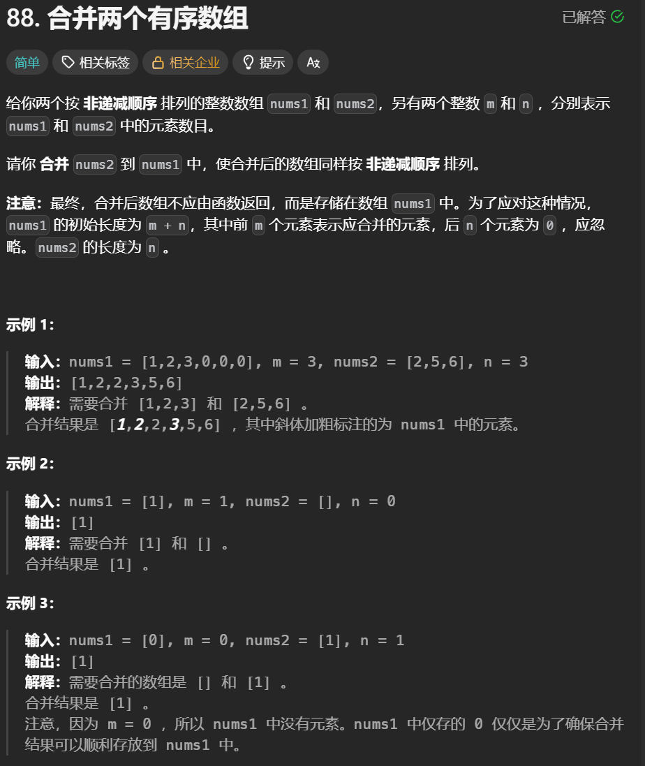 while (l2 >= 0) // l1先结束,继续放nums2的数据