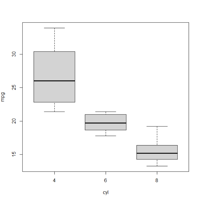 boxplot(mpg ~ cyl, data = mtcars, outline = FALSE) # outline = FALSE