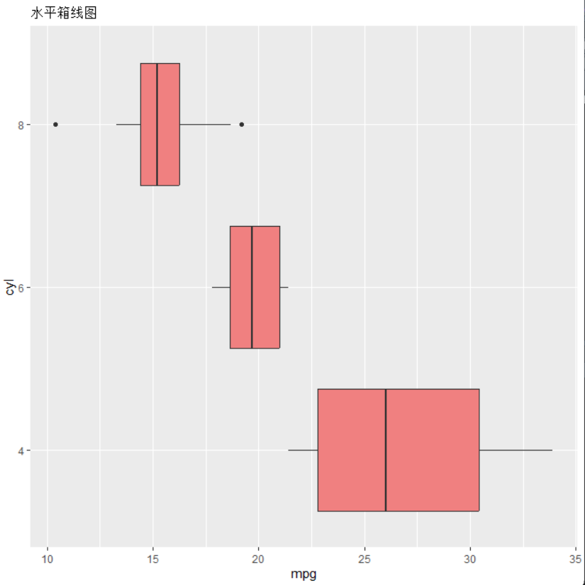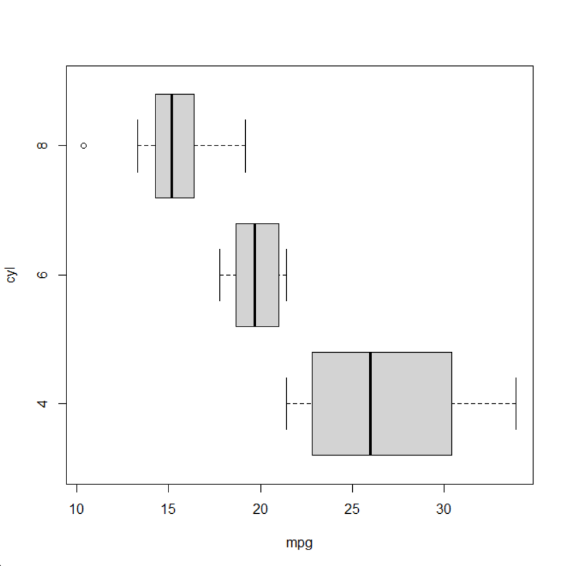 boxplot(mpg ~ cyl, data = mtcars, horizontal = TRUE)