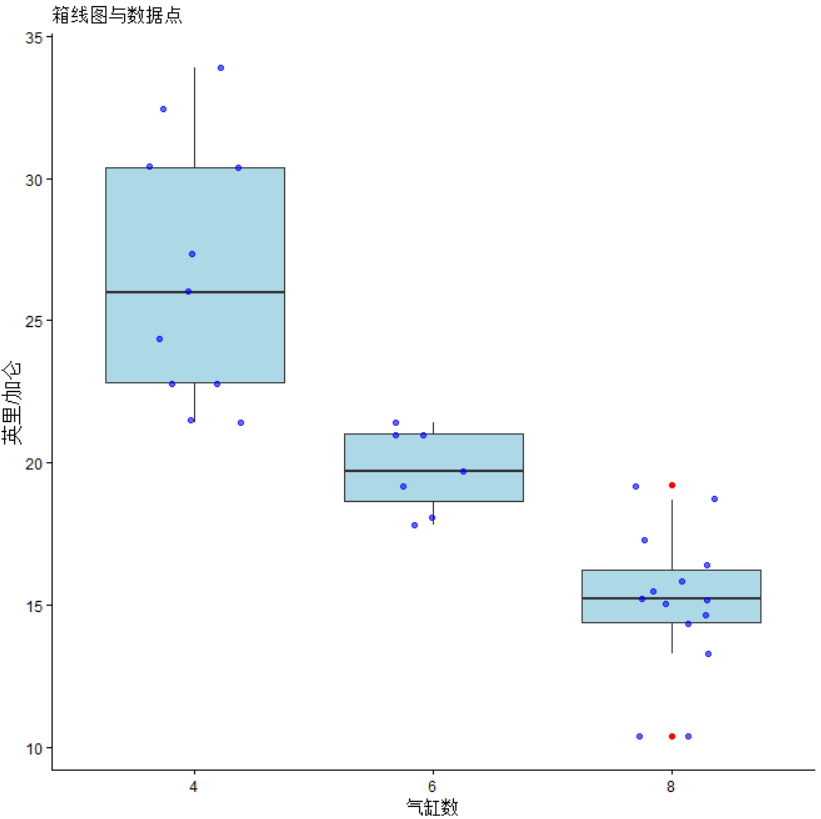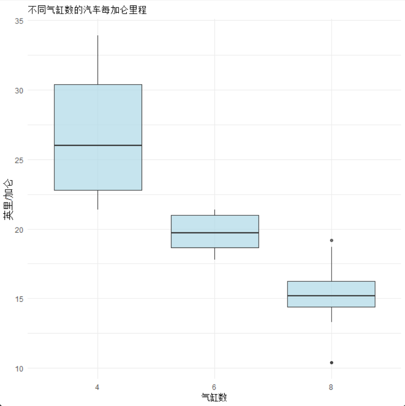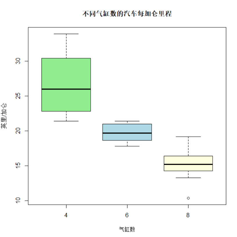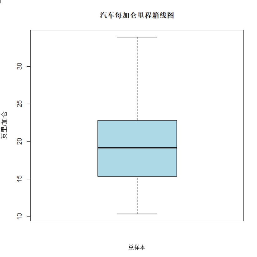 R自带了很多数据集,例如 mtcars,我们可以用其中的 mpg(英里/加仑)数据来绘制箱线图。