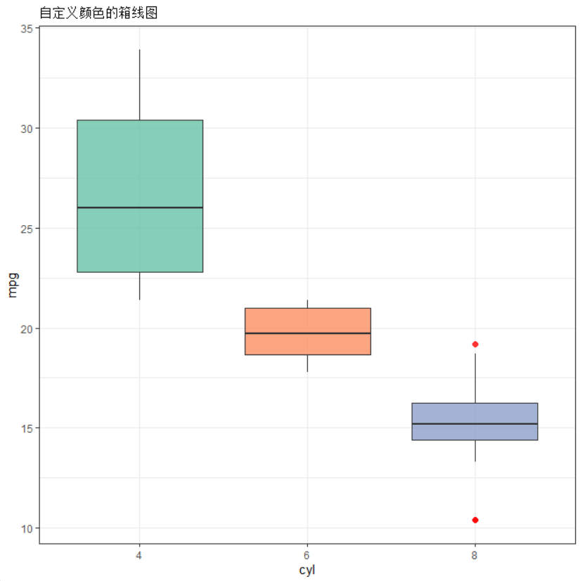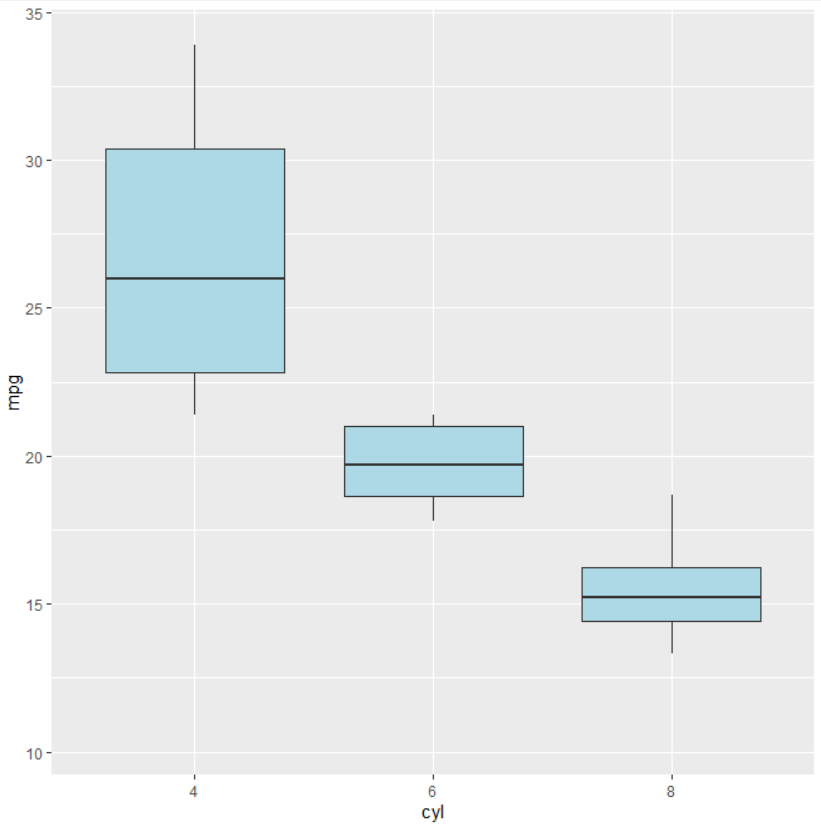 ggplot(mtcars, aes(x = cyl, y = mpg, fill = cyl)) + # 按cyl填充颜色