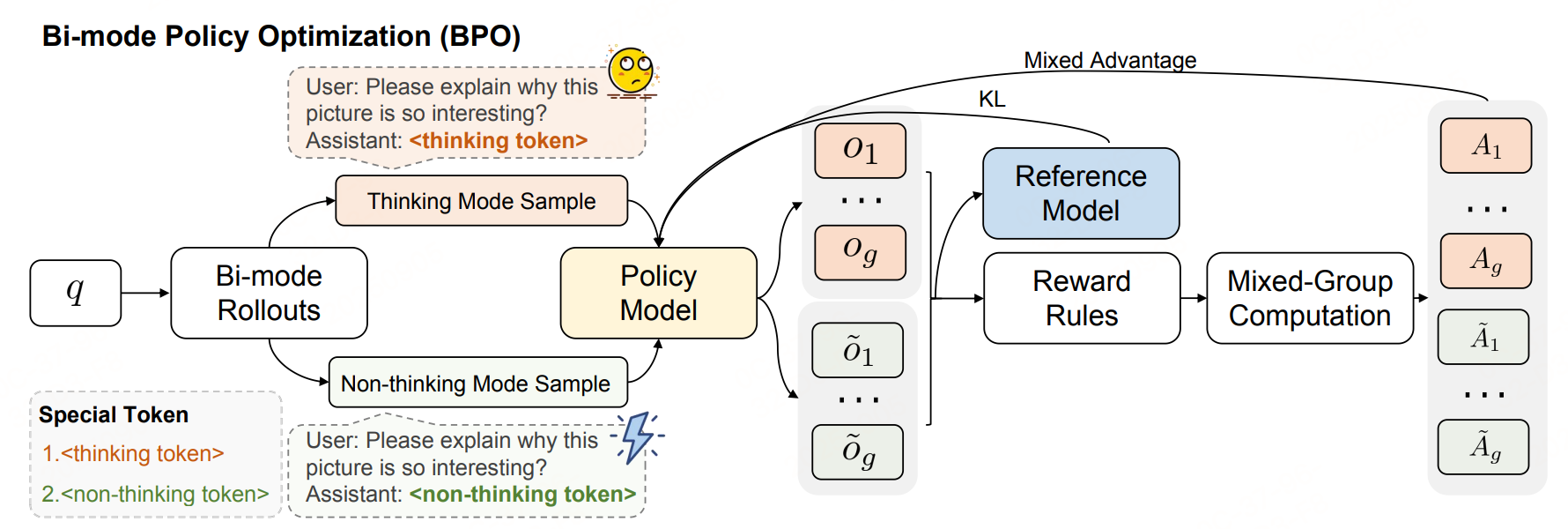 引入双模态策略优化(Bi-mode Policy Optimization, BPO),这是一种为自动思考量身定制的强化学习算法。