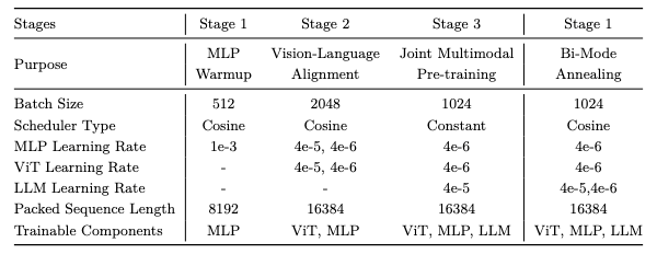 - 阶段 2:视觉-语言对齐在此阶段,ViT 主干网络被解冻,而 LLM 保持冻结状态,使用交错的多模态数据进行训练。这些批量中包含的多样化视觉内容系统性地提升了视觉编码器处理不同视觉领域的能力。