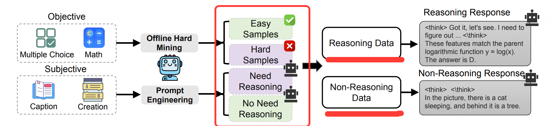 - 若 8 次回答至少 1 次正确(即模型可直接给出答案,属于 "易样本"),标记为 "非推理型"(如 "识别图中的数字""回答'地球自转周期是多少'")。
