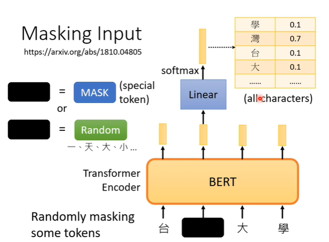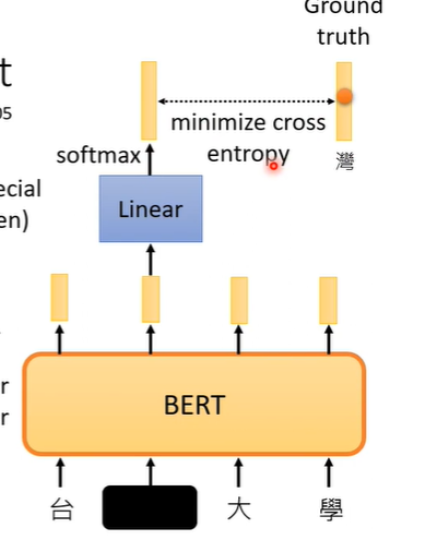 假设输入一段文字,我们随机盖住一些文字,即将文字换为特殊符号(mask),或者随机替换为其他文字。之后用盖住部分对应的BERT输出的向量,做一个linear transform(乘一个矩阵),再做softmax,得到包含所有中文字(常见,自己设定的长向量)一个分布。