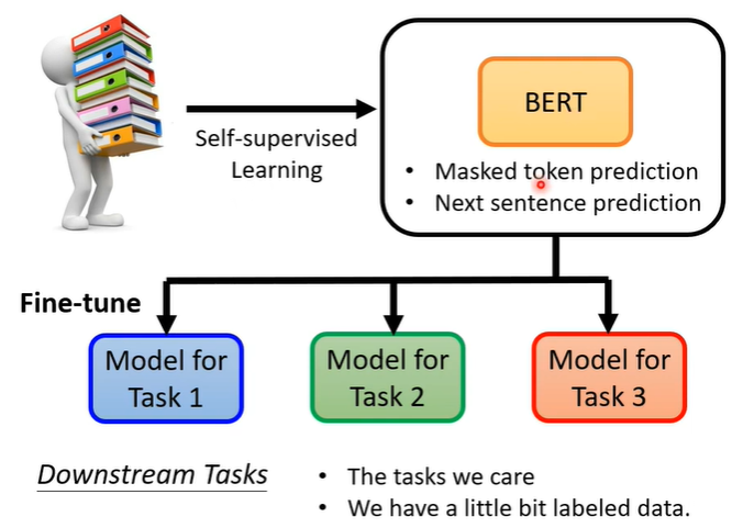 虽然BERT训练时,表现只是会做填空题或者判断两个句子是否可以拼接,但是它可以完成的任务不只是这样而已,还有downstream tasks,但是需要一些有标注的资料。