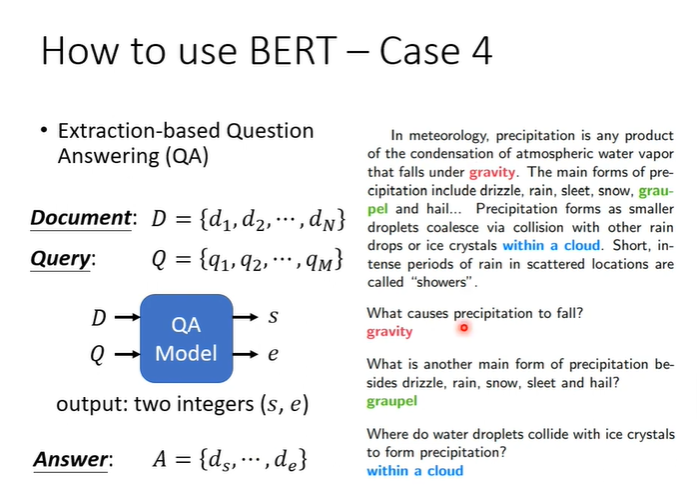 例子4,假设答案一定在文章中的问答系统,输入D,Q假设是中文字,那么每个d和q都代表一个中文字,输入是整篇文章D和问题Q,输出是两个正整数s,e。根据s,e从文章中截取出来的文字就是答案。