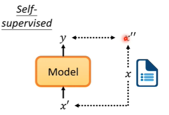 那什么是self-supervised呢?假设我们现在有一堆文章但是没有标注,我们把资料分为两部分,一部分作为模型的输入,一部分作为模型的标注。然后输出的y让他跟作为标注的资料对比,越接近越好。这就是self-supervised learning。