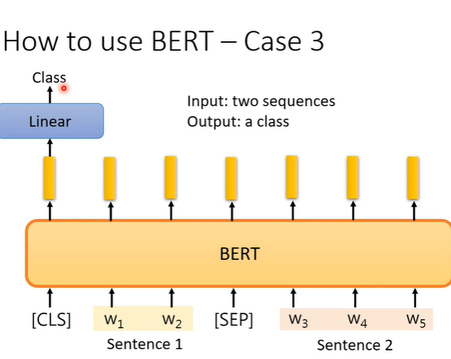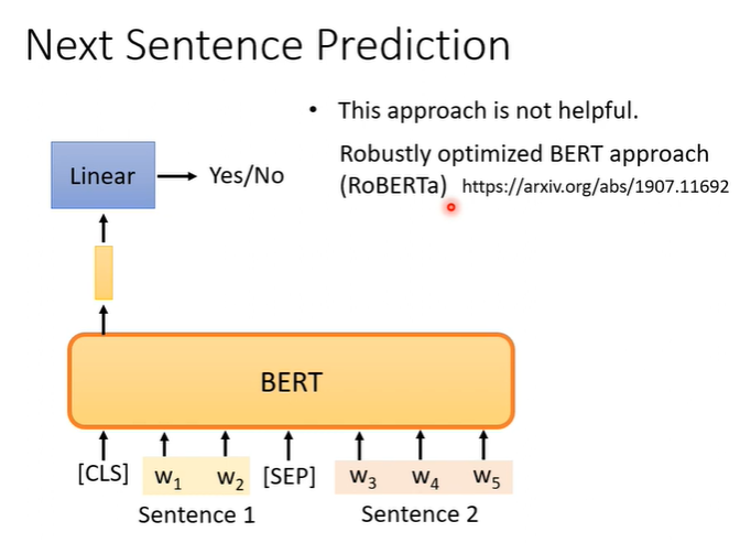 另一个方法叫做Next sentence predition,意思是从资料库拿出两个句子,再两个句子间加入特殊的分隔符号(SEP),再两个句子的最前面加入一个特别的符号(CLS),把两个句子和符号一起丢入BERT,我们只取CLS对应的输出,做linear transform,它要做的是一个二元分类的问题,输出yes或no,他要预测的就是这两个句子是否是相接的。