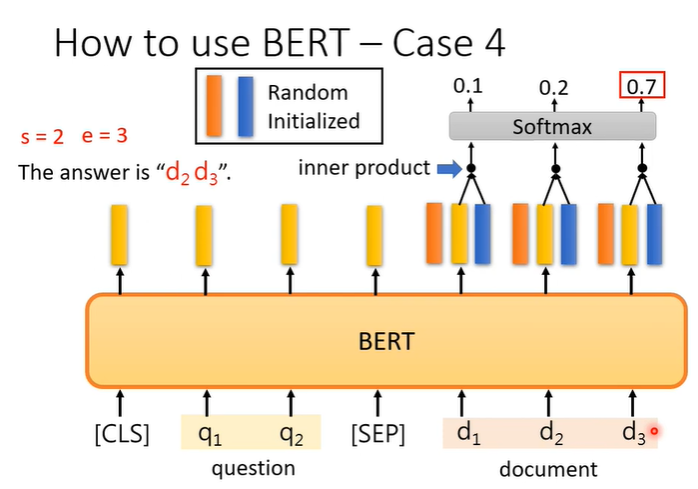 模型要做的事情就是训练两个向量,下图表示为一个橙色,一个蓝色,与文章中的每个文字进行inner product,选出最后得出的分数最高的,一个为起始位置,一个为末尾位置。