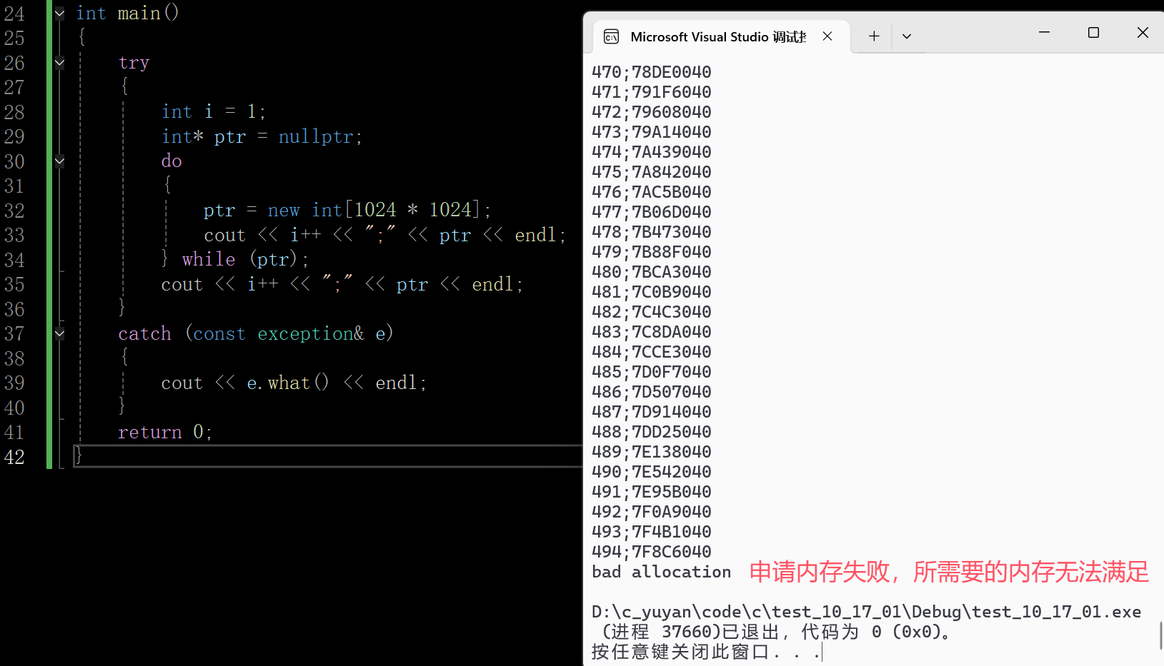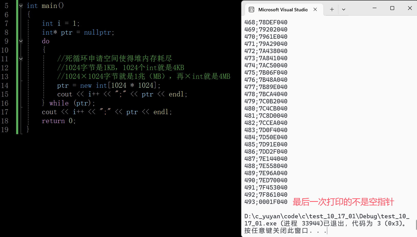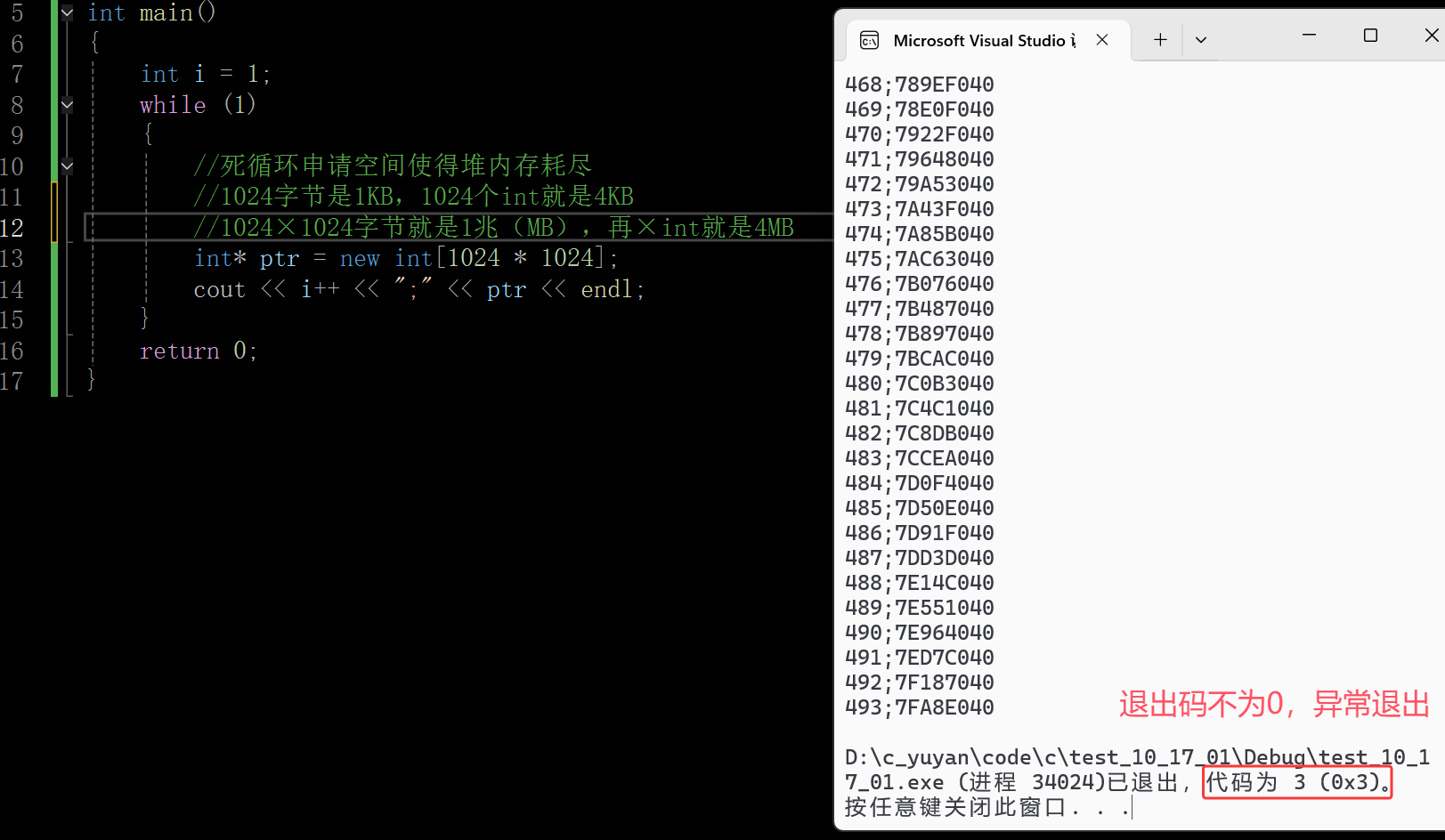 可以看到这里退出码为0,也就是说异常一定是要被捕获的,堆这里能申请到的空间还是蛮大的,上面合计从堆上申请了494×4MB,大概在1.9个G,因为1024MB是1G。这是在X86的运行环境下,整个进程的空间才4G