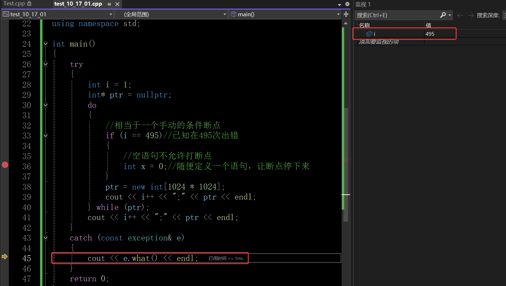 抛异常是C++面向对象处理错误的一种方式,如果一段代码中某个部分会抛异常,要想处理这个错误就要捕获异常,图中try catch就是一种捕获方式,异常我会在后面继承和多态的文章细讲,这里只展示一下用法