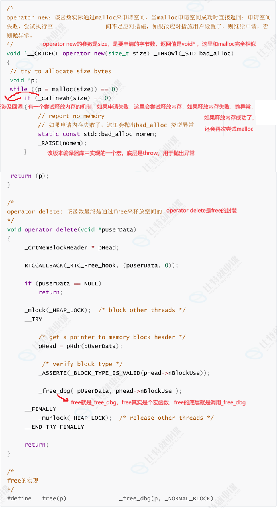 new在底层调用operator new全局函数来申请空间,delete在底层通过operator delete全局函数来释放空间