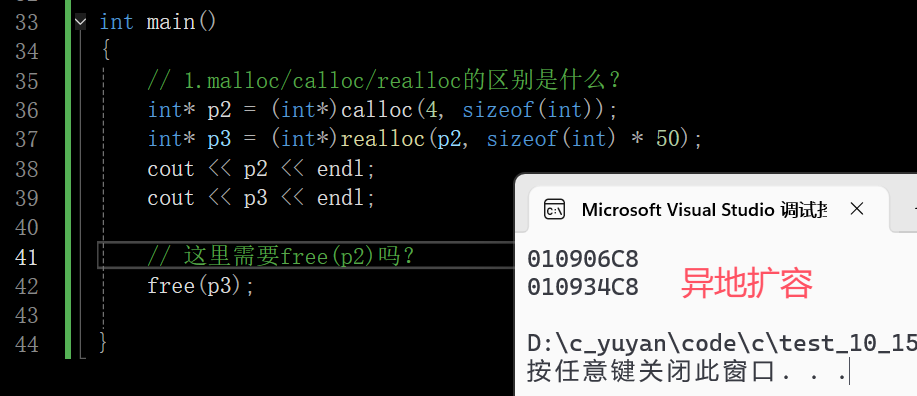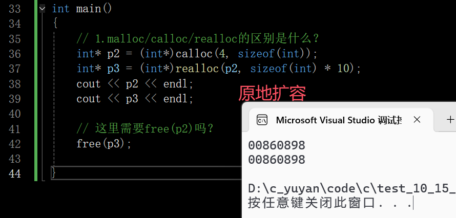 异地扩容也不需要释放p2。realloc开一块新的空间,把数据拷贝过来,其会把旧空间释放,把新空间返回