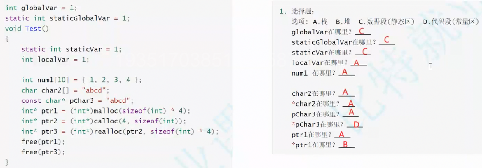 它指向的字符串常量"abcd"存储在 代码段(常量区,D),因此* pChar3在 D - ptr1:ptr1是函数内定义的指针变量,存储在 栈(A)