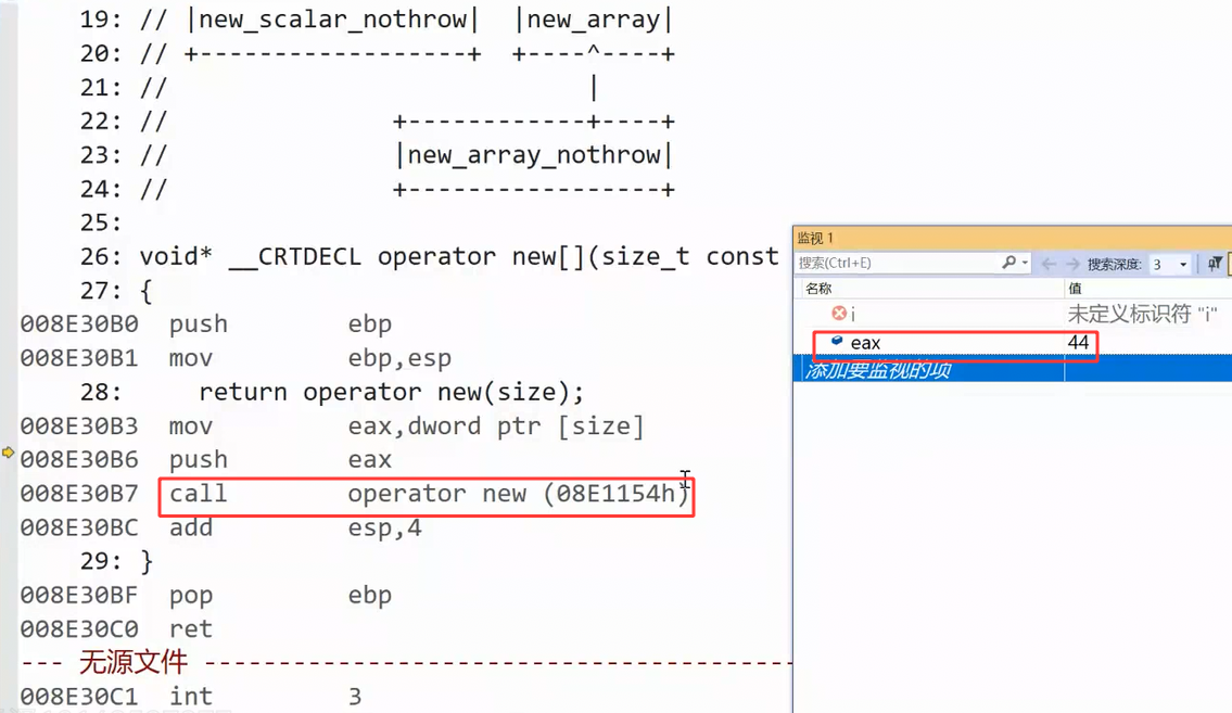 运算符要么转换为对应的运算符重载的调用,要么就转换为指令,这里二者兼有,new和delete都转换为对应的指令了,但是不是转换为一个指令,而是多个指令,这多个指令又包含了调用函数,这里看一下new的反汇编