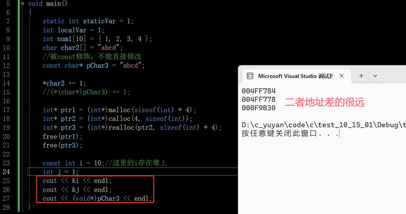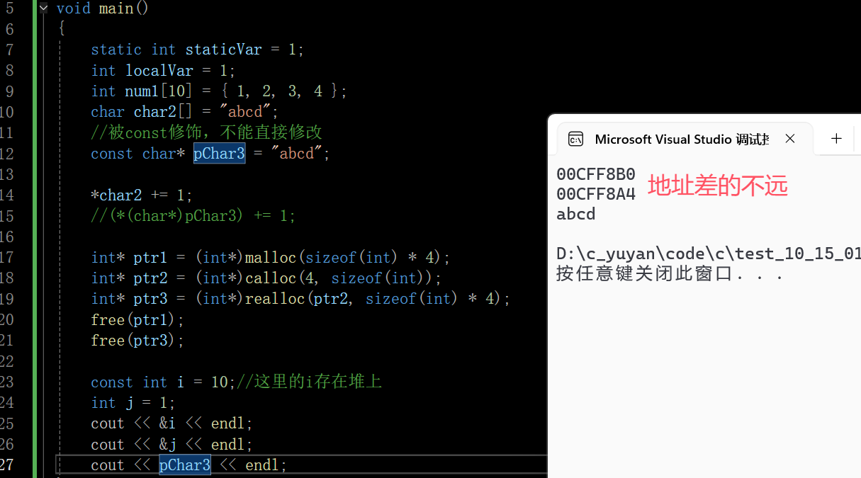 也可以看到i和j二者的地址离的不远,pChar3是常量区的地址,pChar3本身是一个栈上的局部变量,但打印的时候是打印其指向的值,其值的地址就是一个常量区的地址