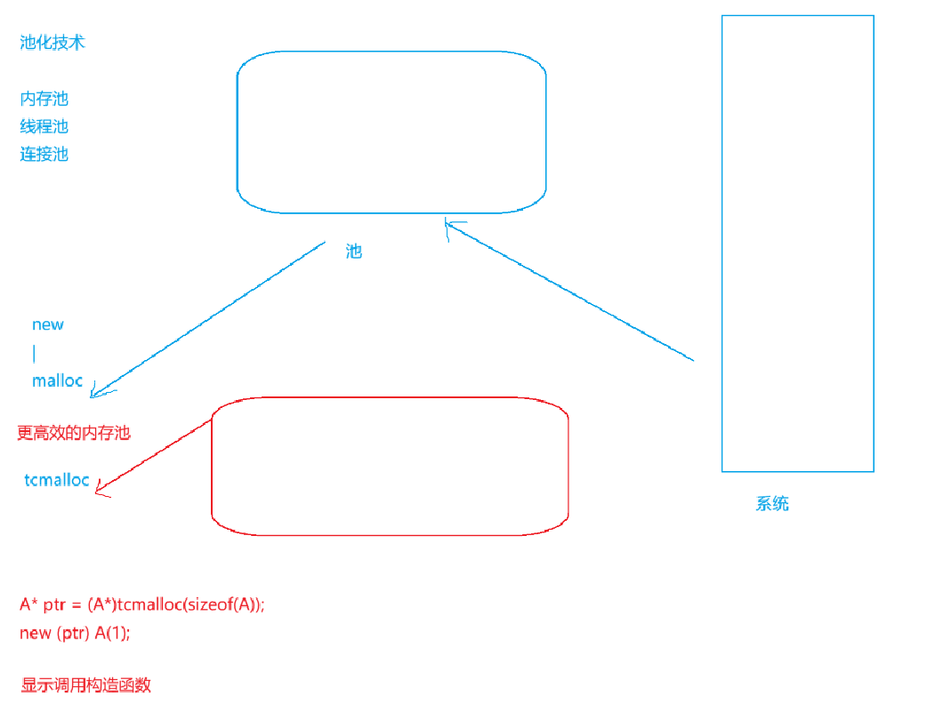 new,malloc这套机制可以理解为直接找系统申请空间,其实C++中malloc本身也是一个内存池,但是在某些特殊场景下,malloc这个内存池不够高效