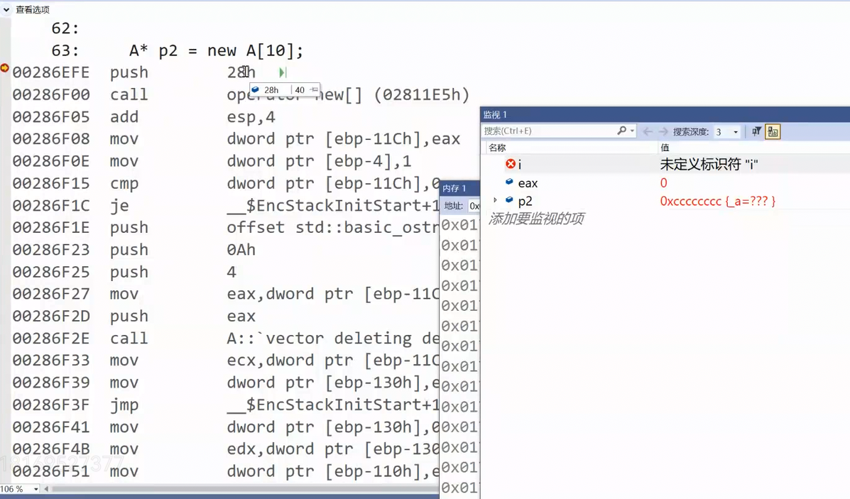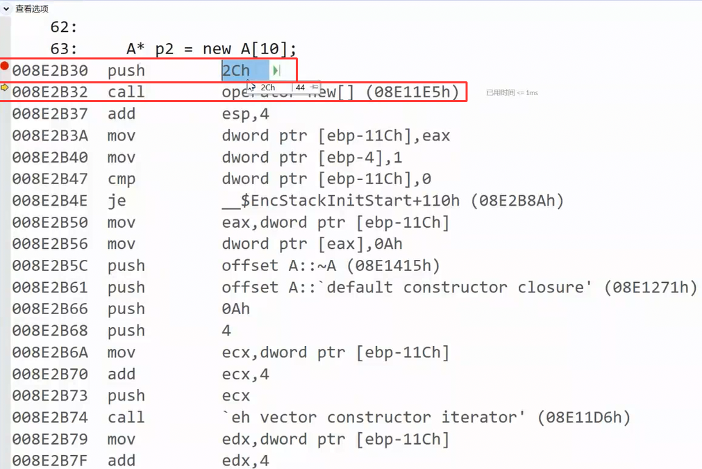 这里转到反汇编,push就是给operator new[ ]压的参数,参数是44