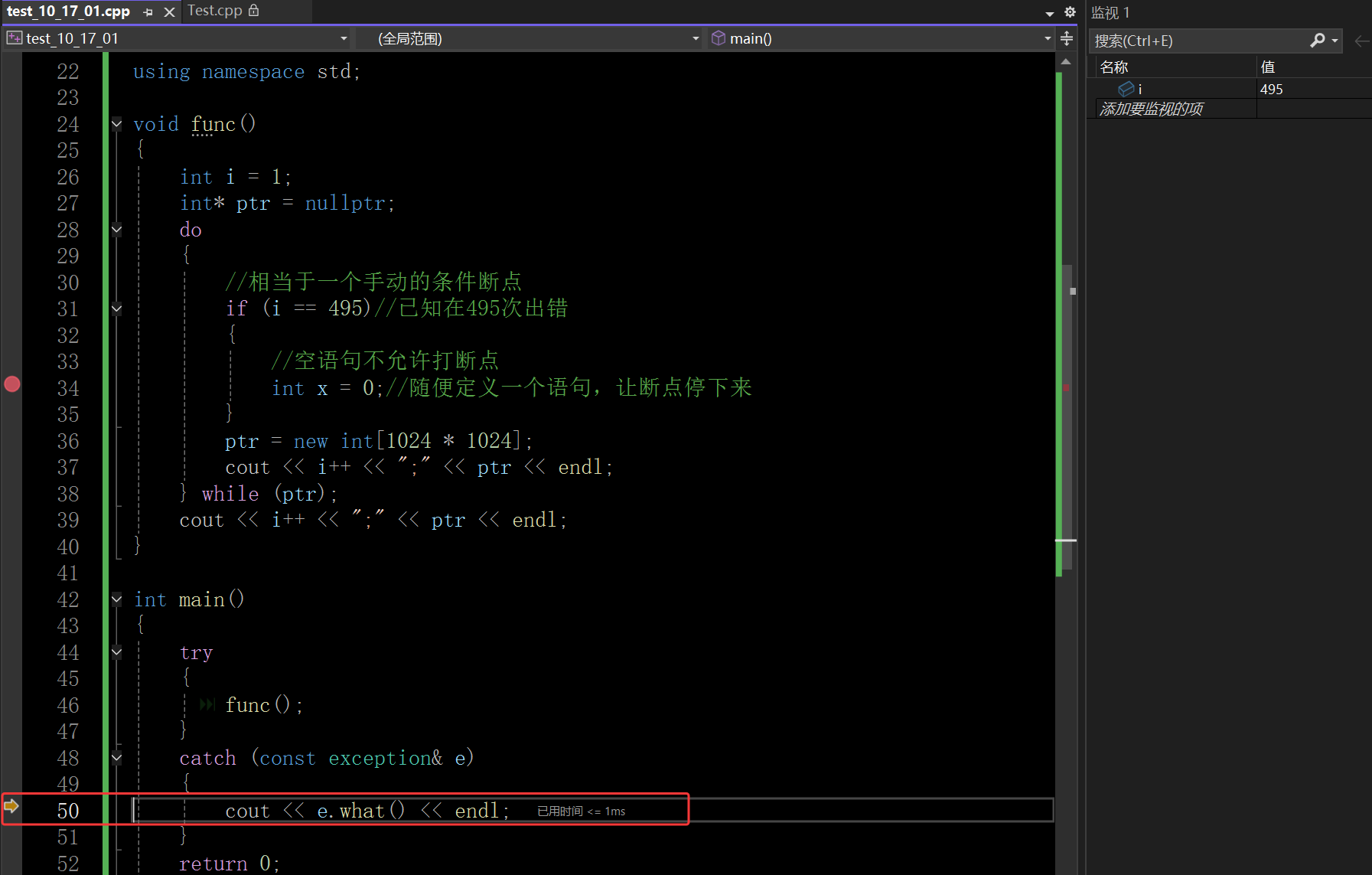 下面再说一下异常捕获的特性,在上面如果想在循环中通过调试来找异常的问题,那么就要调试495次才可以,这样一次一次按效率太低了,下面就说两种技巧