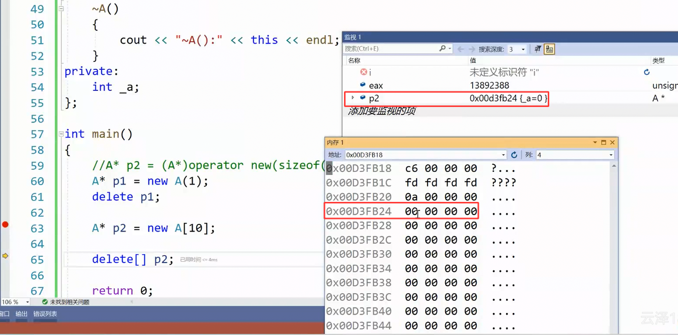 多开了这四个字节,申请的空间起始在第一个箭头位置,返回的空间起始位置是第二个箭头位置,前面的4个字节存了一个10进去,10就是new申请的对应的对象个数,再看一下内存窗口