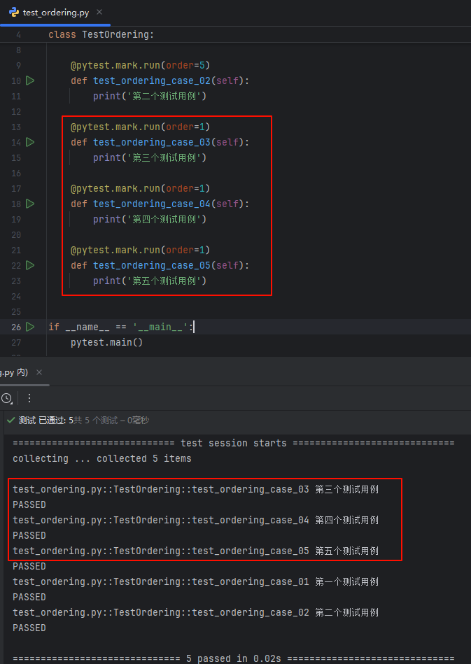 通过 pytest 装饰器 @pytest.mark.run(order=4) 调用插件里面的 run 方法来设置执行顺序;