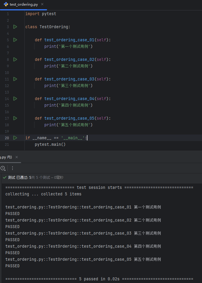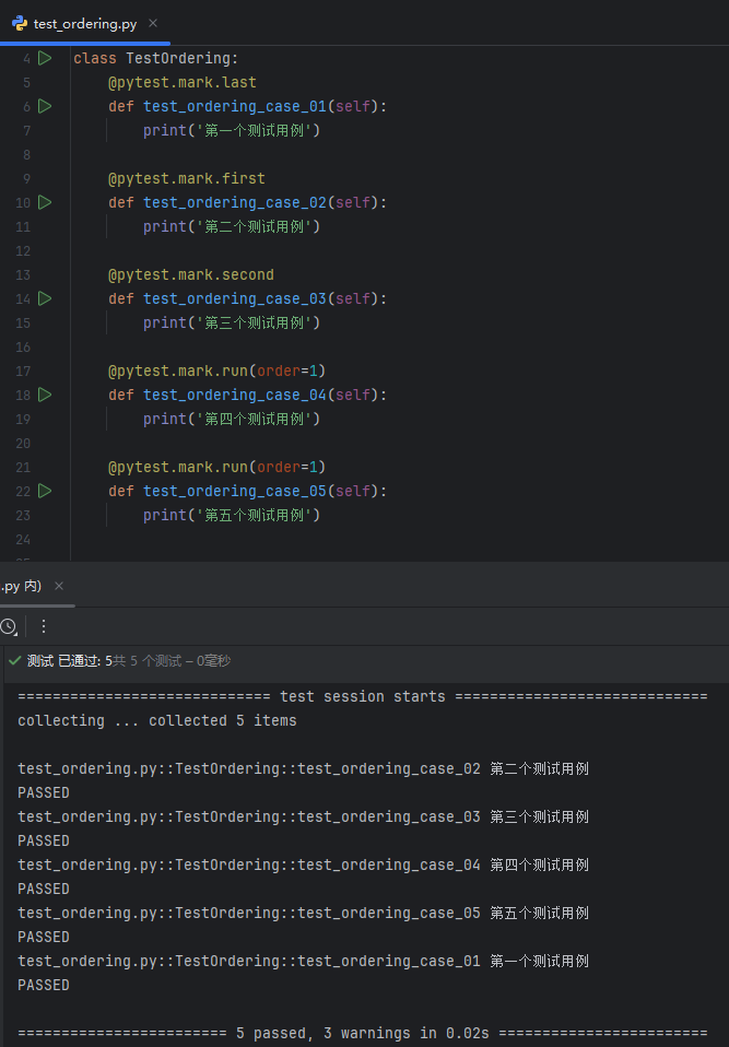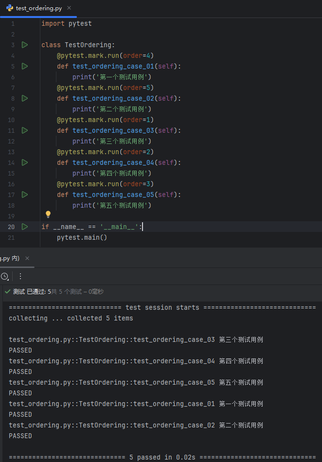 因为在默认情况下,pytest 会以特定的顺序运行测试用例;可以使用 pytest-ordering 插件去自定义设置测试用例的执行顺序;