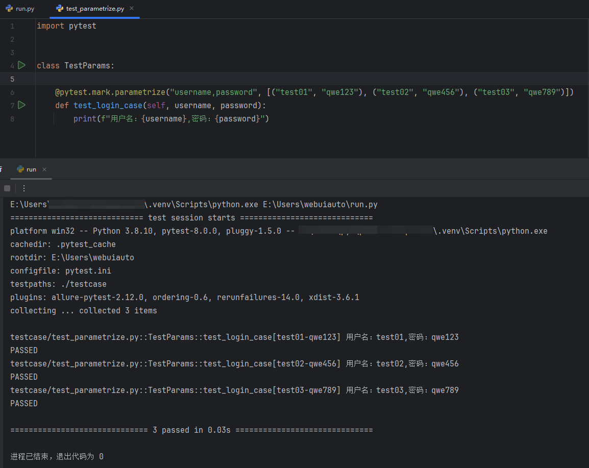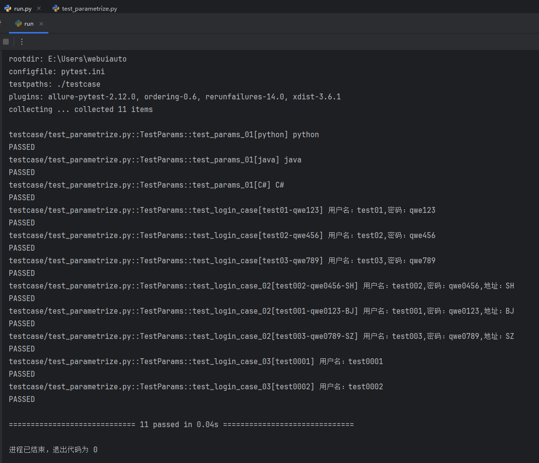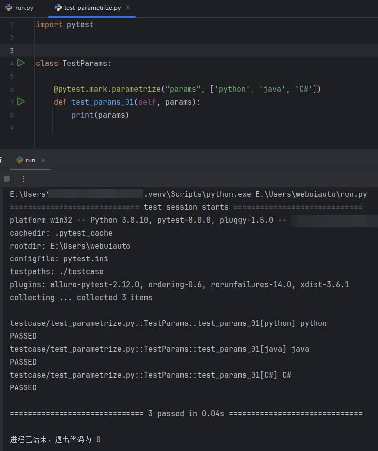 运行 run.py 主函数文件,查看 test_params_01 测试方法能不能接收到 @pytest.mark.parametrize 装饰器参数化传递的参数;