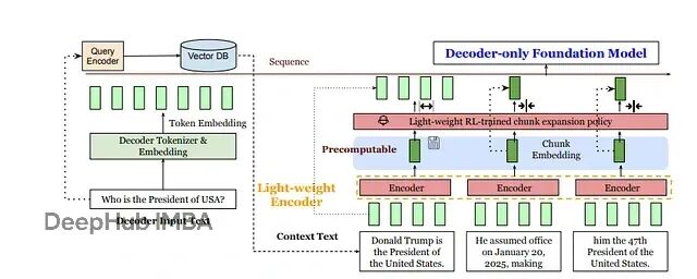 一个强化学习策略(小型神经网络)接着动态选择部分块,将其完整token嵌入用来替代单向量形式。这种"选择性展开"只把最关键的文本注入解码器,其余部分维持压缩状态。最终结果是内存和注意力中的嵌入数量显著减少,生成速度明显提升。