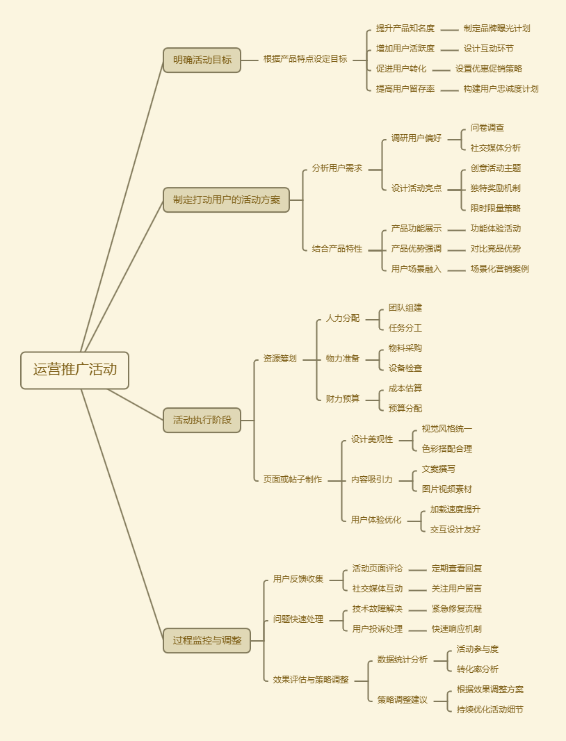 运营推广活动是产品运营的重要手段之一。要明确活动目标,制定打动用户的活动方案,这需要根据产品的特点和用户的需求来确定。在活动执行阶段,要进行资源的筹划和页面或帖子的制作,确保活动的顺利开展。同时,要进行过程监控,关注活动页面或帖子等途径,了解用户的反馈和意见,快速处理存在的问题,并评估效果,看是否需要调整推广策略。通过这些运营推广活动,可以提高产品的知名度和影响力,促进用户的转化和留存。