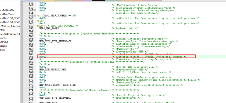 找到USB接口描述符这里我们将bInterfaceProtocol的值改为1:(0 --- NONE,1 --- Keyboard(键盘),2 --- Mouse (鼠标),3~255 Reserved)