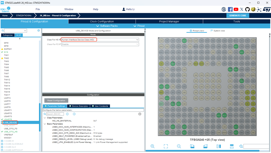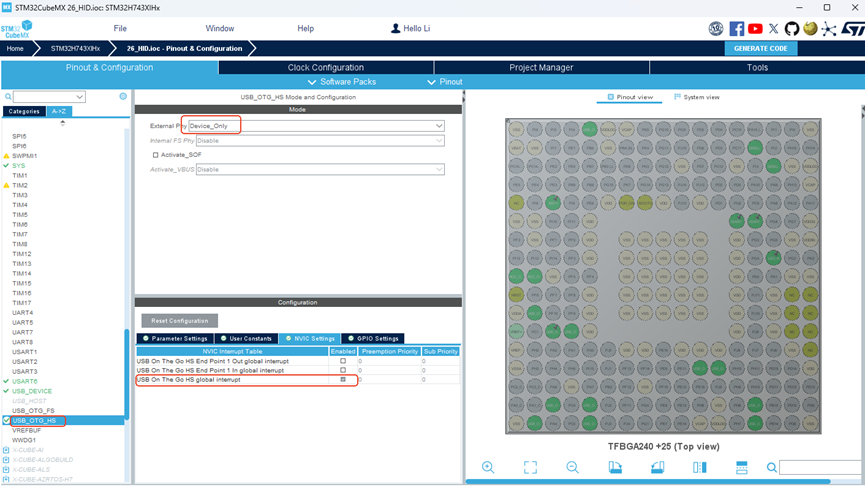 我们参考前面章节STM32H743-结合CubeMX新建HAL库MDK工程,打开CubeMX软件,重复步骤不再展示,我们来看配置USB部分如下图所示:
