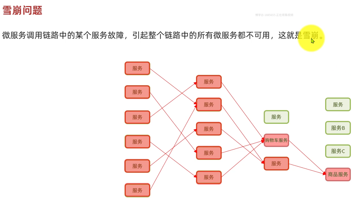 雪崩问题就是由于某个服务的提供者出现了一些小问题,导致请求阻塞等问题,当其他服务来请求的时候就会持续等待直到耗尽资源,自己也崩溃掉,然后大部分的服务都会因此宕机,这就是雪崩问题