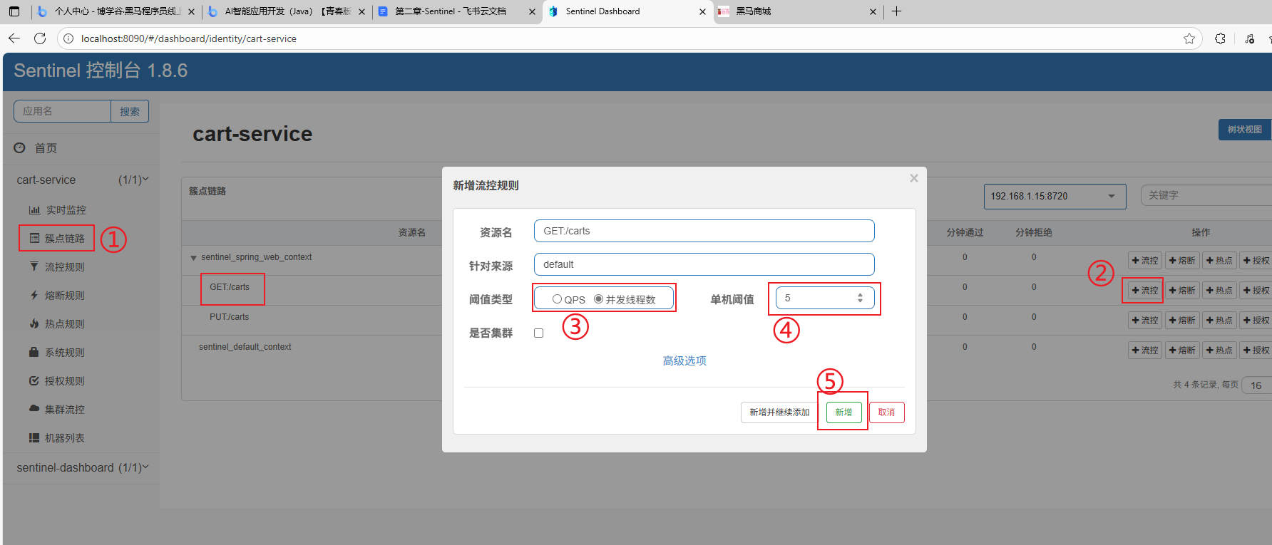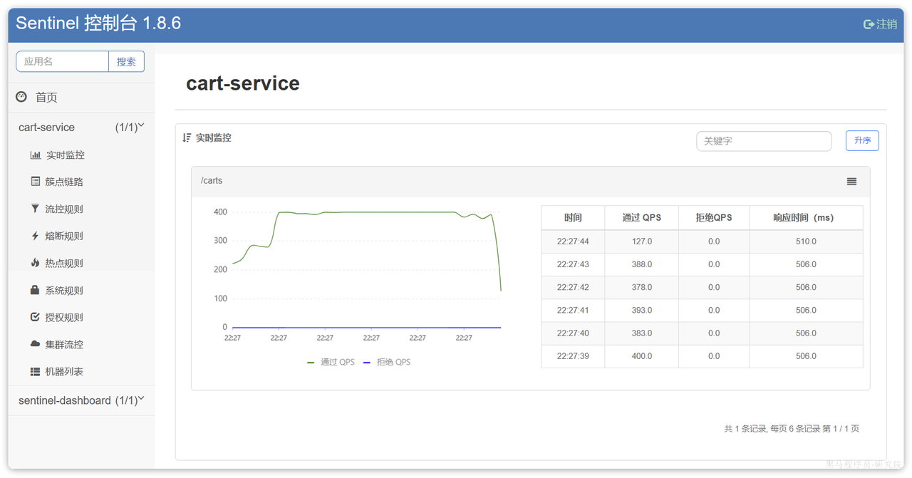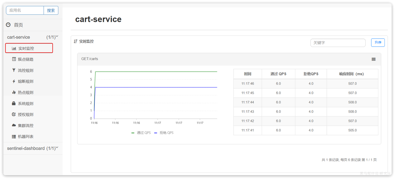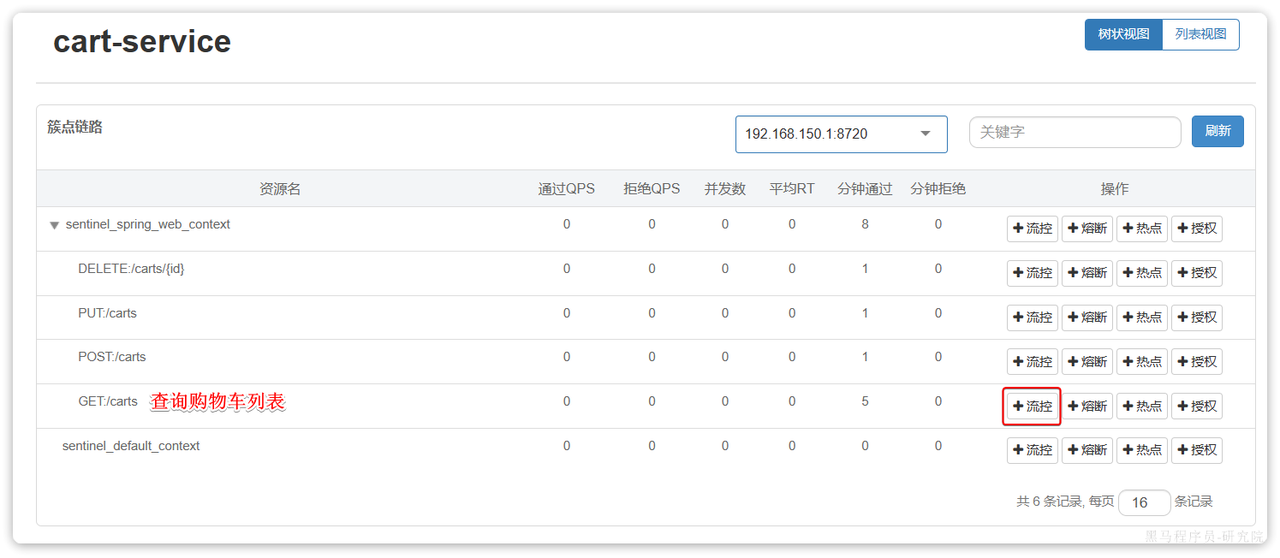 这样就把查询购物车列表这个簇点资源的流量限制在了每秒6个,也就是最大QPS为6.