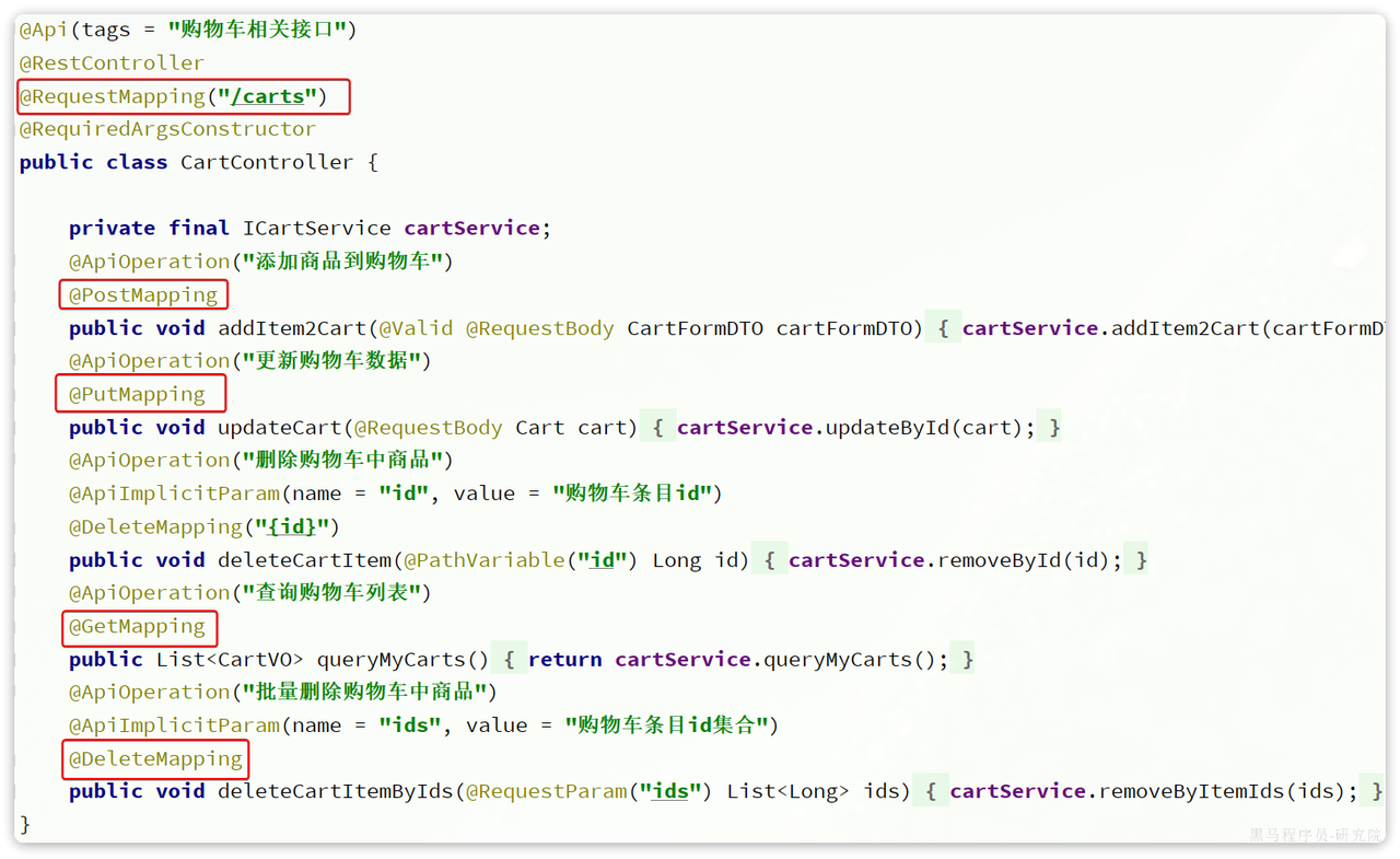 不过,需要注意的是,我们的SpringMVC接口是按照Restful风格设计,因此购物车的查询、删除、修改等接口全部都是/carts