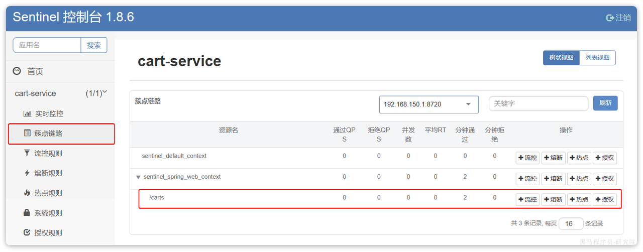 然后,重启服务,通过页面访问购物车的相关接口,可以看到sentinel控制台的簇点链路发生了变化: