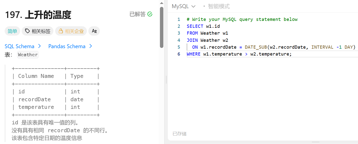 筛选温度更高的记录:添加条件w1.temperature > w2.temperature,仅保留当天温度高于前一天的记录,最终返回这些记录的id。
