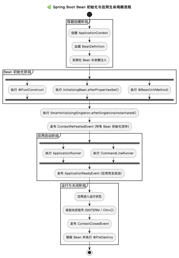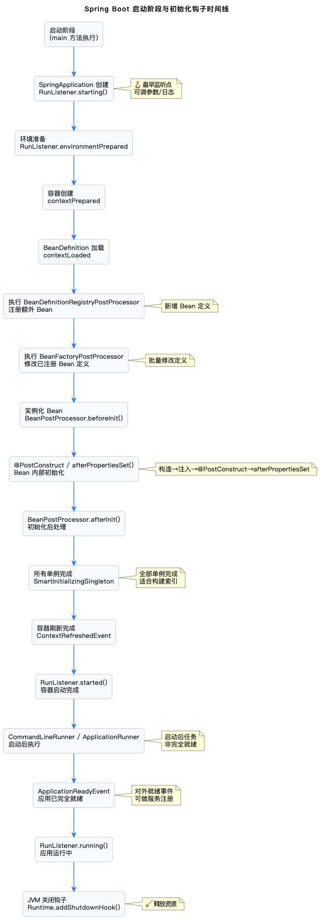 Spring Boot 的"初始化钩子(Initialization Hooks)"指的是在 Spring Boot 应用启动阶段的各个生命周期点 ,可以插入自定义逻辑的机制。这些钩子让我们可以在 Spring 容器初始化前后、Bean 加载前后、应用启动完成后 等关键时机执行代码,实现各种定制化需求。