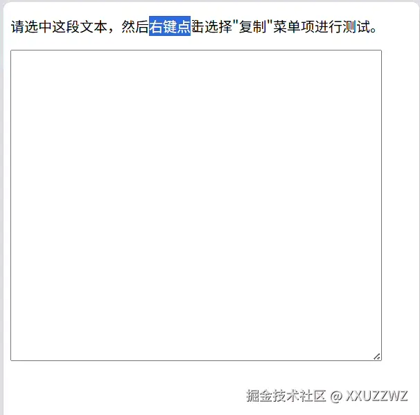 只能复制当前选中的内容,我们需要先选中 textarea 中的文本 -