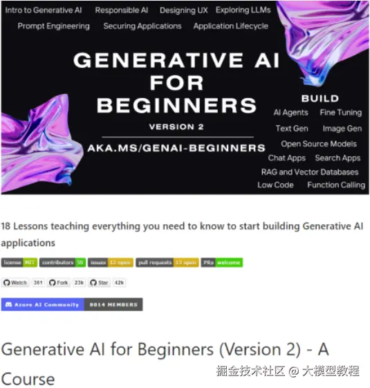 内容涵盖 LLM、提示词设计、文本生成等关键技能。带你动手构建聊天机器人、智能客服等应用。没有基础也能学,真·新手福音,还有 Azure 云服务工具链教学。
