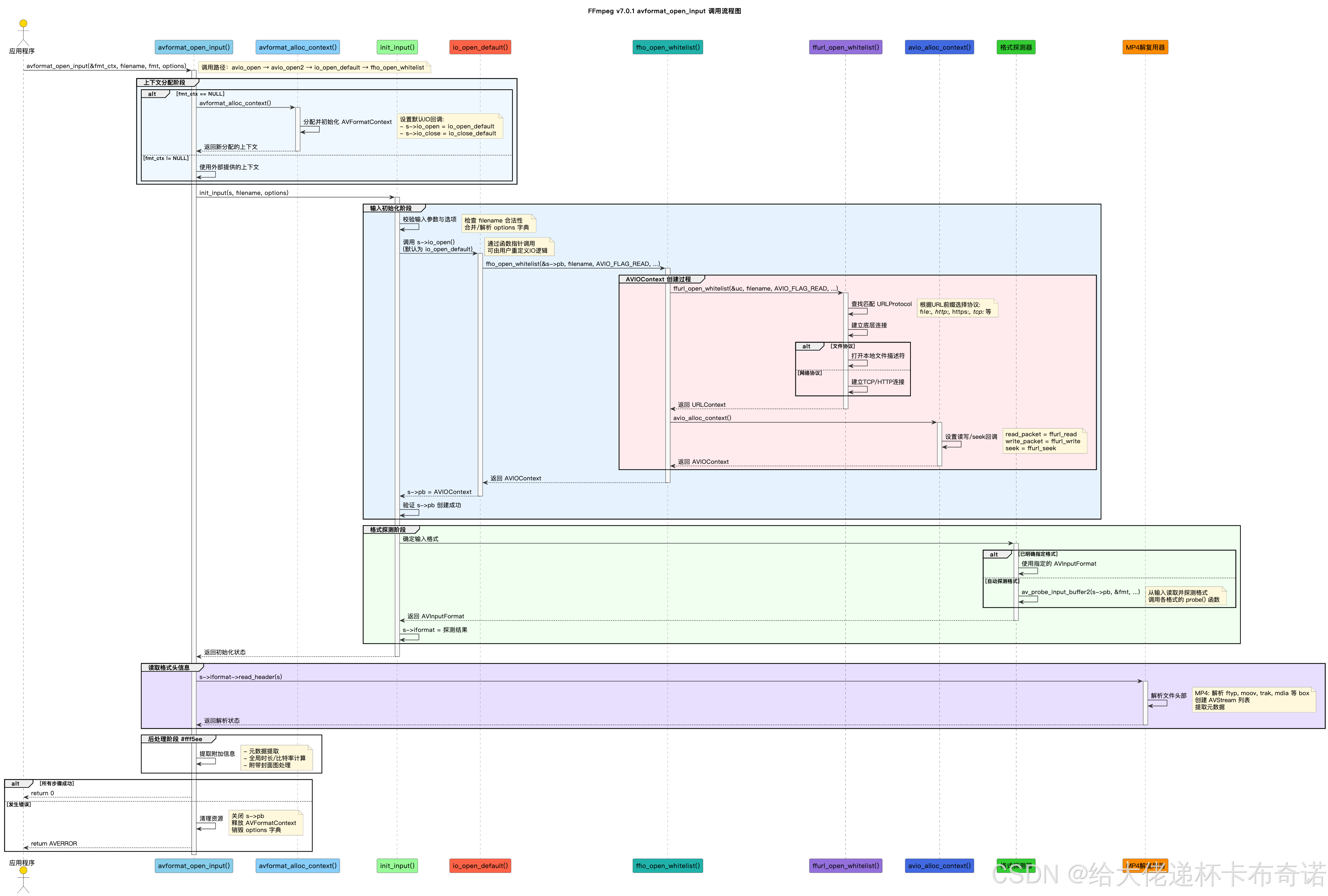 - AVInputFormat* fmt强制指定输入文件的封装格式。通常传 NULL,让FFmpeg自动探测格式。